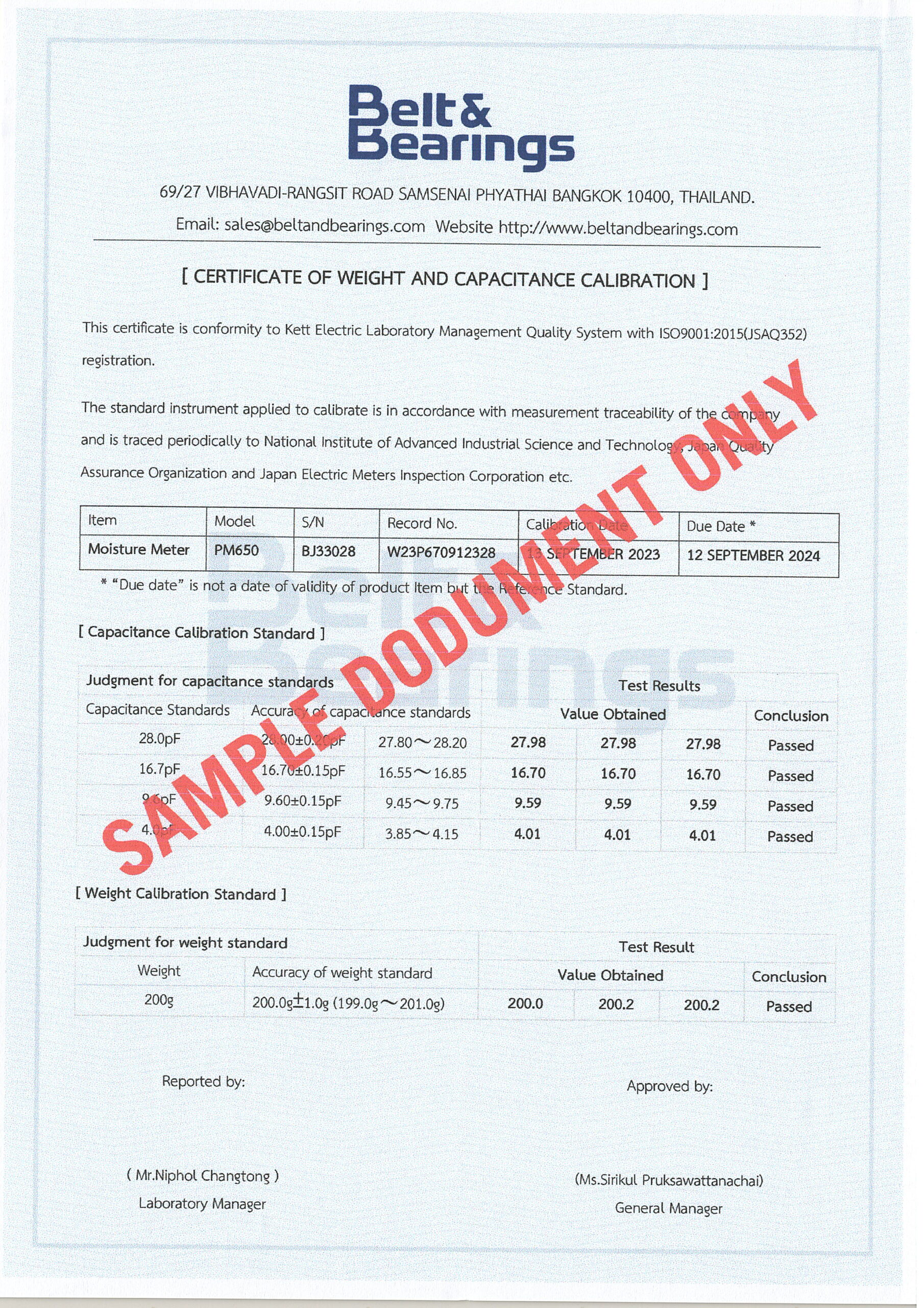 ตัวอย่างใบเซอร์ Certificate เช็คประจุ คาริเบทประจุ